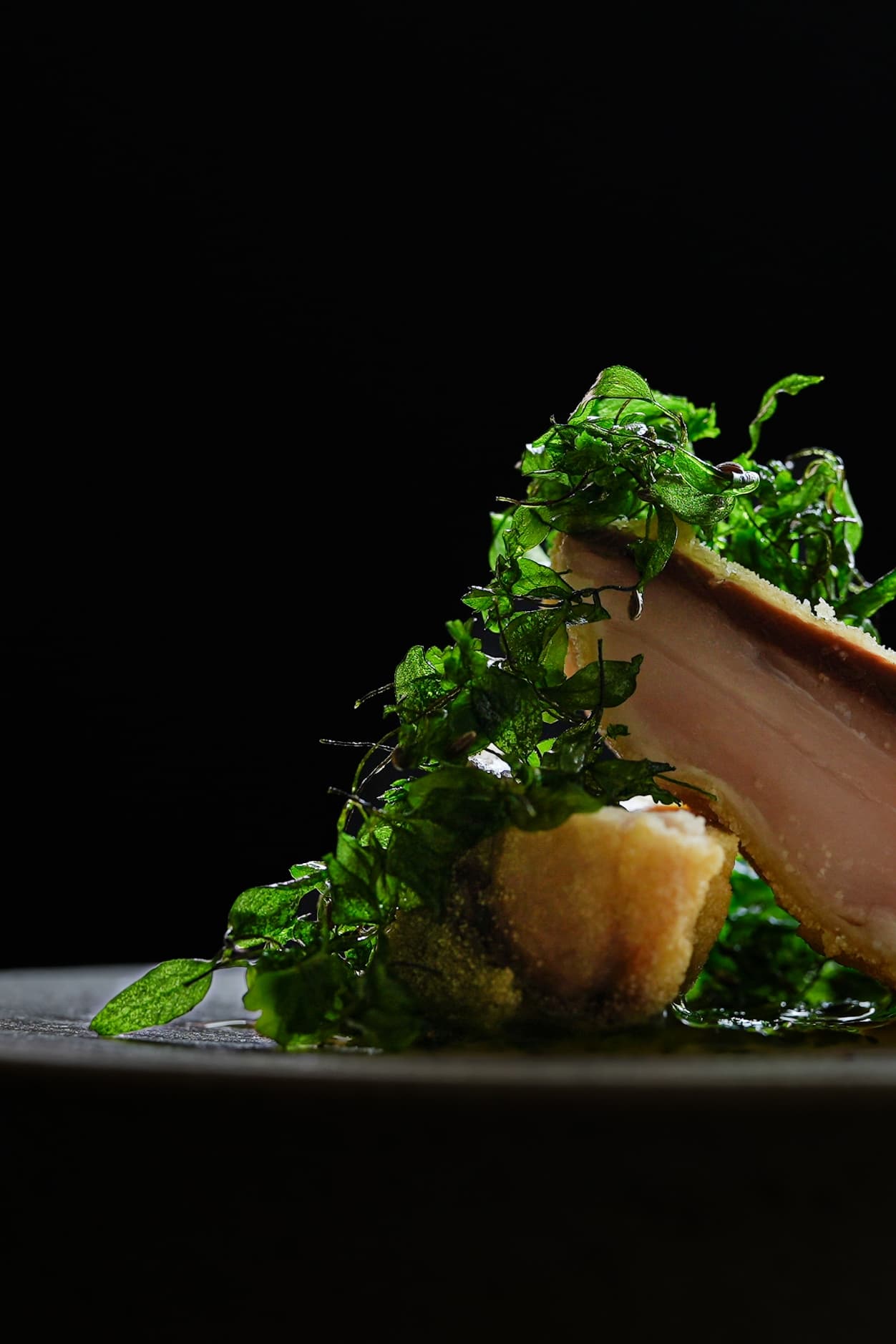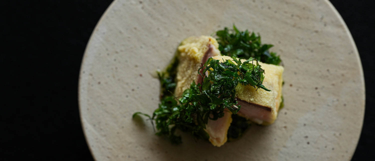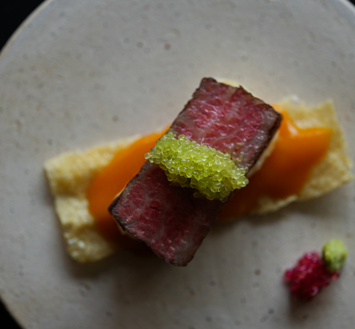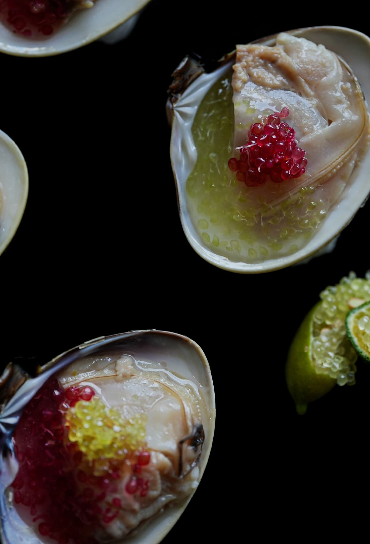 「森のキャビア」とも称されるフィンガーライムは、栽培が難しく国内での⽣産は僅かで⼤変希少な柑橘類です。果⾁がつぶれにくく⼝に含むまで香りも少ないので噛んだ時に弾ける食感と、かぐわしい⾹りは食べる人を虜にします。お料理のアクセントはもちろん、スイーツやカクテルにも使用され、テーブルに彩りと華やかさを添えています。
